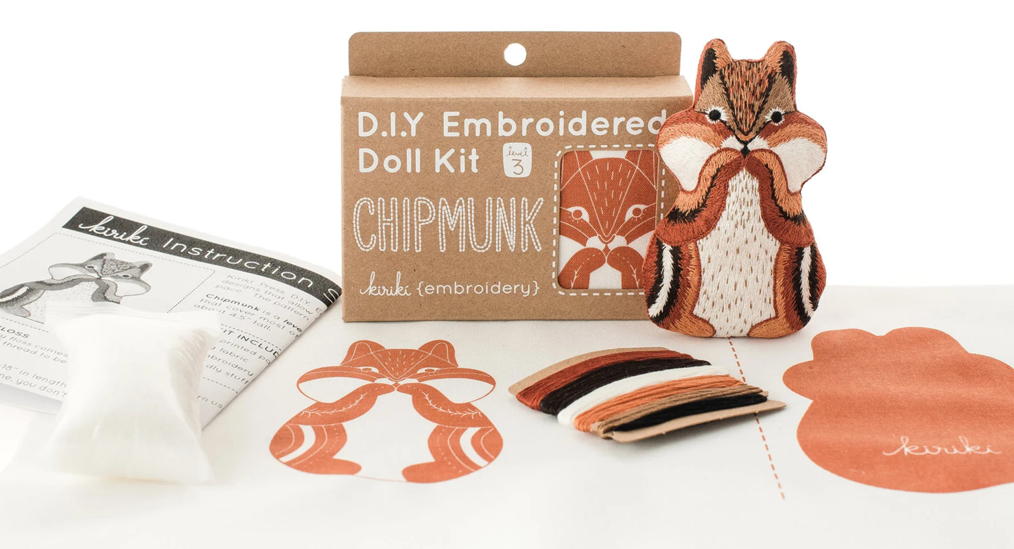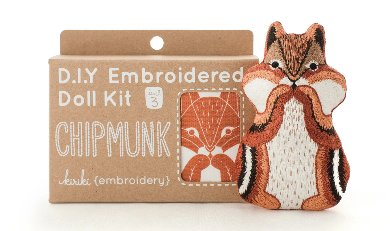 Chipmunk Doll embroidery kit. The nut and seed hoarder of the north has been caught with snacks in their cheeks… again!